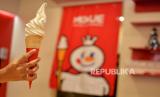 Anak menyantap es krim di gerai minuman dan es krim Mixue di Jalan Ampera, Jakarta, Selasa (24/1/2023). (FOTO : Republika/Thoudy Badai)