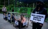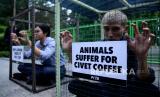Aktivis dari PETA Asia berada di dalam jeruji kandang saat melaksanakan aksi di depan Kementerian Lingkungan Hidup dan Kehutanan (KLHK), Jakarta, Rabu (25/1/2023). Pada aksi tersebut mereka mendesak KLHK untuk menutup operasi peternakan luwak dan menghentikan produksi kopinya yang dinilai mengeksploitasi hewan. Selain itu, mereka juga meminta Kementerian Agama untuk menghapuskan jaminan produk halal kopi luwak. (FOTO : Republika/Putra M. Akbar)