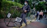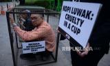 Aktivis dari PETA Asia membawa jeruji kandang saat melaksanakan aksi di depan Kementerian Lingkungan Hidup dan Kehutanan (KLHK), Jakarta, Rabu (25/1/2023). Pada aksi tersebut mereka mendesak KLHK untuk menutup operasi peternakan luwak dan menghentikan produksi kopinya yang dinilai mengeksploitasi hewan. Selain itu, mereka juga meminta Kementerian Agama untuk menghapuskan jaminan produk halal kopi luwak. (FOTO : Republika/Putra M. Akbar)