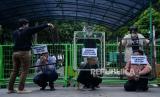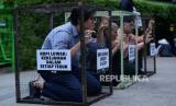 REPUBLIKA.CO.ID,JAKARTA -- Aktivis dari PETA Asia berada di dalam jeruji kandang saat melaksanakan aksi di depan Kementerian Lingkungan Hidup dan Kehutanan (KLHK), Jakarta, Rabu (25/1/2023).
