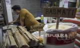 Pedagang menata beras di kiosnya di Pasar Kosambi, Kota Bandung, Rabu (25/1/2023). (FOTO : ABDAN SYAKURA/REPUBLIKA)