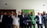 Ketua Harian DPP Partai Gerindra Sufmi Dasco Ahmad (tiga kiri), Wakil Ketua Umum Partai Nasdem Ahmad Ali (tengah) danWakil Sekretaris Jenderal PKB Syaiful Huda (tiga kanan) serta para petinggi partai melambaikan tangan sebelum melakukan pertemuan di Sekretariat Bersama Gerindra-PKB, Jakarta, Kamis (26/1/2023). (FOTO : Republika/Prayogi.)