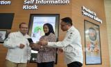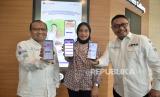 Direktur Operasi PT Bank Muamalat Indonesia Tbk Wahyu Avianto (kiri) menjelaskan pendaftaran haji melalui Muamalat Digital Islamic Network (DIN) kepada nasabah disaksikan oleh Plt Direktur Utama PT Bank Muamalat Indonesia Tbk Hery Syafril (kanan) di Jakarta, Kamis, (26/1/2023). (FOTO : Republika/Edwin Dwi Putranto)