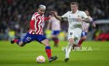 Pemain Atletico Madrid Angel Correa (kiri) menendang bola dibayangi pemain Real Madrid Toni Kroos pada pertandingan sepak bola perempat final Copa del Rey Spanyol antara Real Madrid dan Atletico Madrid di stadion Santiago Bernabeu di Madrid, Jumat (27/1/2023) dini hari WIB. (FOTO : AP Photo/Bernat Armangue)