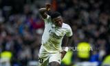 Pemain Real Madrid Vinicius Junior berselebrasi setelah mencetak gol ketiga timnya pada pertandingan sepak bola perempat final Copa del Rey Spanyol antara Real Madrid dan Atletico Madrid di stadion Santiago Bernabeu di Madrid, Jumat (27/1/2023) dini hari WIB. (FOTO : AP Photo/Bernat Armangue)