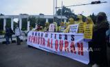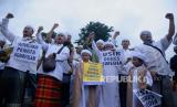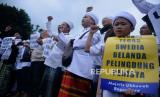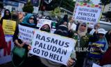 Massa dari Majelis Ukhuwah Bogor Raya saat melaksanakan Aksi Bela Al-Quran di kawasan Tugu Kujang, Kota Bogor, Jawa Barat, Jumat (27/1/2023). Pada aksi tersebut mereka mengecam aksi bakar Al-Quran yang dilakukan politikus Swedia Rasmus Paludan dan politikus sayap kanan Belanda Edwin Wagensveld. Selain itu mereka juga mengancam akan memboikot produk Swedia, meminta Pemerintah untuk mengusir Duta Besar Swedia dari Indonesia dan meminta untuk menghapuskan segala tindakan Islamophobia yang terjadi di Eropa. (FOTO : Republika/Putra M. Akbar)