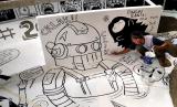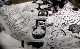 Seniman menyelesaikan karya komik untuk pameran Dagingtumbuh volume 20 Melawan Rempah-Rempah di Tempuran Space, Yogyakarta, Jumat (27/1/2023). Pameran ini akan menampilkan 30 komik terpilih dari kontributor Dagingtumbuh volume 20, yang dikurasi oleh Terra Bajraghosa. Judul Melawan Rempah-Rempah ini sebagai penggambaran semangat untuk bangkit kembali dari kondisi Covid. Semangat tidak menyerah pada keadaan, pulih, bangkit, baik sebagai manusia maupun manusia yang berkarya. Dalam pameran ini, seniman Eko Nugroho dan Terra Bajraghosa mengajak pengunjung pameran secara playfull seperti berada dalam wahana melalui instalasi korden komik, mural, bebatuan, dalam ruangan Tempuran Space yang unik. (FOTO : Republika/Wihdan Hidayat)