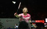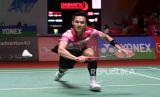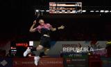 Pemain bulu tangkis tunggal putra Indonesia Jonatan Christie mengembalikan kok ke arah lawannya tunggal putra India Lakshya Sen dalam babak perempat final Daihatsu Indonesia Master 2023 di Istora Senayan, Jumat (27/1/2023). Pada pertandingan itu Jonatan berhasil menang dengan skor 15-21, 21-10 dan 21-13 sekaligus melangkah ke babak semifinal. (FOTO : Republika/Edwin Dwi Putranto)