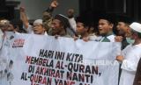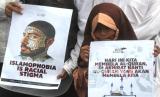 REPUBLIKA.CO.ID, MALANG -- Komunitas Muslim Malang Bergerak membawa poster saat berunjuk rasa di depan Balai Kota Malang, Jawa Timur, Jumat (27/1/2023).