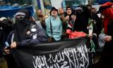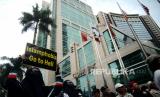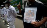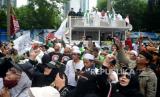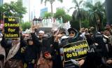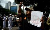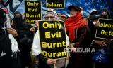Umat muslim mengikuti aksi bela Al-Quran di Depan Kedubes Swedia, Kuningan ,Jakarta, Senin (30/1/2023). Mereka mengecam Politikus Swedia-Denmark Rasmus Paludan yang membakar Kitab Suci Al-Qur (FOTO : Republika/Prayogi.)