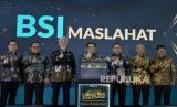 Direktur Sales & Distribution Bank Syariah Indonesia Anton Sukarna (tengah) bersama Ketua Pengurus BSI Maslahat Riko Wardhana (kiri), Direktur Eksekutif BSI Maslahat Sukoriyanto (ketiga kanan) dan Komisaris Utama BSI Adiwarman Karim (ketiga kiri) saat Grand Launching dan Public Expose BSI Maslahat di Jakarta, Senin (30/1/2023).  (FOTO : Republika/Edwin Dwi Putranto)