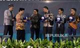 Direktur Sales & Distribution Bank Syariah Indonesia Anton Sukarna (ketiga kiri) menyerahkan penghargaan saat Grand Launching dan Public Expose BSI Maslahat di Jakarta, Senin (30/1/2023).  (FOTO : Republika/Edwin Dwi Putranto)