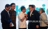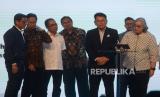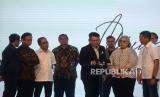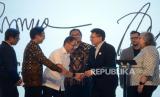 Wakil Menteri BUMN Pahala Nugraha Mansury (kiri), Menteri Kesehatan Budi Gunadi Sadikin (dua kiri), Direktur Utama PT Bio Farma Honesti Basyir (tiga kiri), Presiden Direktur Prudential Syariah Omar Sjawaldy Anwar (tiga kanan) dan Presiden Direktur Prudential Indonesia Michellina L. Triwardhany (kanan) usai Penandatanganan MoU Kerja Sama di Jakarta, Selasa (31/1/2023). Kolaborasi antara industri asuransi jiwa dan industri farmasi ini bertujuan untuk mendukung kemajuan sektor kesehatan di Indonesia. Kemitraan ini juga merupakan salah satu perwujudan komitmen Prudential Indonesia dan Prudential Syariah dalam mewujudkan masyarakat Indonesia yang lebih sehat dan sejahtera sekaligus mendukung peningkatan ekosistem digital di bidang kesehatan. (FOTO : Republika/Prayogi.)