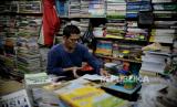 Pedagang buku mengelem lembaran kertas buku di Toko Buku Restu, Jalan Kwitang Raya, Jakarta Pusat, Selasa (31/1/2023). Toko Buku Restu merupakan salah satu toko buku legendaris di Jakarta yang sudah ada sejak tahun 1970-an. Toko buku tersebut menyediakan ribuan koleksi buku dari berbagai jenis genre seperti novel, pendidikan, agama, hukum, sejarah dan cerpen. Rata-rata buku yang dijual di tempat tersebut merupakan buku bekas, yang dijual mulai dari harga Rp10 ribu hingga jutaan rupiah tergantung keaslian dan tahun terbit. Menurut pedagang buku Subhil (53) mengatakan, ditengah kemajuan teknologi, yang menyebabkan pergeseran prilaku pembeli dari offline menjadi online tidak membuat ia patah arang, menurutnya pembeli yang hendak ke toko buku rata-rata merupakan langganan, pelajar serta sejumlah kolektor buku-buku vintage. Meski demikian, beberapa pedagang juga menyediakan layanan online dengan menjual beberapa koleksinya di akun media sosial pribadinya. (FOTO : Republika/Thoudy Badai)
