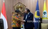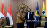 Ketua Umum Partai Golkar Airlangga Hartarto bersama Ketua Umum Partai Nasdem Surya Paloh saat melakukan pertemuan di Kantor DPP Partai Golkar, Jakarta, Rabu (1/2/2023). Pertemuan tersebut sebagai bentuk silahturahmi sekaligus agenda lanjutan dari pertemuan sebelumnya. (FOTO : Republika/Prayogi.)