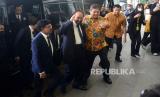 Ketua Umum Partai Golkar Airlangga Hartarto bersama Ketua Umum Partai Nasdem Surya Paloh bersiap melakukan pertemuan di Kantor DPP Partai Golkar, Jakarta, Rabu (1/2/2023). (FOTO : Republika/Prayogi.)