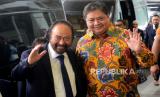 Ketua Umum Partai Golkar Airlangga Hartarto bersama Ketua Umum Partai Nasdem Surya Paloh menyapa wartawan sebelum melakukan pertemuan di Kantor DPP Partai Golkar, Jakarta, Rabu (1/2/2023). (FOTO : Republika/Prayogi.)