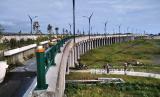 Jembatan Kretek II terlihat dari samping saat uji coba pembukaan di Bantul, Yogyakarta, Rabu (1/2/2023). Pemerintah melalui Direktorat Jenderal Bina Marga dan Dinas Perhubungan Kabupaten Bantul melakukan uji coba pembukaan Jembatan Kretek II sebagai penghubung kawasan wisata di Jalur Jalan Lintas Selatan (JJLS) Jawa. Jembatan dengan panjang 556,6 meter ini memiliki empat lajur jalan dan satu lajur untuk pejalan kaki. Jembatan ini menghubungkan kawasan wisata Pantai Parangtritis dan Pantai Samas, Bantul. (FOTO : Republika/Wihdan Hidayat)