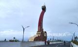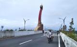 Warga berfoto di bawah maskot Jembatan Kretek II saat uji coba pembukaan, Bantul, Yogyakarta, Rabu (1/2/2023). Pemerintah melalui Direktorat Jenderal Bina Marga dan Dinas Perhubungan Kabupaten Bantul melakukan uji coba pembukaan Jembatan Kretek II sebagai penghubung kawasan wisata di Jalur Jalan Lintas Selatan (JJLS) Jawa. Jembatan dengan panjang 556,6 meter ini memiliki empat lajur jalan dan satu lajur untuk pejalan kaki. Jembatan ini menghubungkan kawasan wisata Pantai Parangtritis dan Pantai Samas, Bantul. (FOTO : Republika/Wihdan Hidayat)
