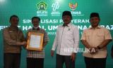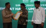 Kepala Badan Penyelenggara Jaminan Produk Halal (BPJPH) Kemenag Muhammad Aqil Irham (kiri) menyerahkan sertifikat halal kepada salah satu UMKM binaan Baznas RI disaksikan oleh Ketua Baznas RI KH Noor Achmad (kanan) pada acara simbolisasi penyerahan sertifikat halal UMKM binaan Baznas RI di Jakarta, Rabu (1/2/2023). Simbolisasi penyerahan sertifikat halal ini sebagai awal untuk mendorong serifikasi halal UMKM binaan Baznas dan LAZ di seluruh Idonesia. Acara penyerahan sertifikat halal tersebut dihadiri oleh 20 UMKM binaan Baznas RI yang bergeak di berbagai jenis usaha. (FOTO : Republika/Prayogi.)