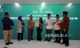 Kepala Badan Penyelenggara Jaminan Produk Halal (BPJPH) Kemenag Muhammad Aqil Irham (kiri) menyerahkan sertifikat halal kepada salah satu UMKM binaan Baznas RI disaksikan oleh Ketua Baznas RI KH Noor Achmad (dua kanan) dan Wakil Ketua Baznas RI Mokhamad Mahdum (kanan) pada acara simbolisasi penyerahan sertifikat halal UMKM binaan Baznas RI di Jakarta, Rabu (1/2/2023). Simbolisasi penyerahan sertifikat halal ini sebagai awal untuk mendorong serifikasi halal UMKM binaan Baznas dan LAZ di seluruh Idonesia. Acara penyerahan sertifikat halal tersebut dihadiri oleh 20 UMKM binaan Baznas RI yang bergeak di berbagai jenis usaha. (FOTO : Republika/Prayogi.)