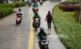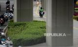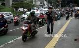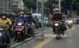 Pengendara motor melintas di jalur pedestrian di Kawasan MT Haryono, Cawang, Jakarta, Kamis (2/2/2023). (FOTO : Republika/Prayogi.)