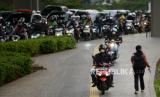 Para pengendara sepeda motor melakukan pelanggaran disiplin lalu lintas dengan menggunakan trotoar sebagai jalurnya untuk menghindari kemacetan lalu lintas, tapi mengambil hak para pejalan kaki.