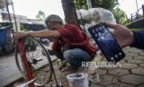 Seorang Penyandang Masalah Kesejahteraan Sosial (PMKS) Bayu Aji (50) mengoperasikan alat pengisi dayaterai buatannya di Jalan Japati, Coblong, Kota Bandung, Provinsi Jawa Barat, Ka bamis (2/2/2023).  (FOTO : ABDAN SYAKURA/REPUBLIKA)
