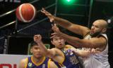 Pebasket Satria Muda Pertamina Jakarta, Laurentius Steven Oei (kiri) berusaha melewati hadangan pebasket Elang Pacific Caesar Surabaya, Daffa Dhoifullah (kanan) dan Morakinyo Michael Williams (tengah) dalam pertandingan Indonesia Basketball League (IBL) Seri II di GOR Big Arena Bimasakti, Malang, Jawa Timur, Kamis (2/2/2023). Satria Muda Mengalahkan Pacific Caesar dengan skor 101-90. ANTARA FOTO/Ari Bowo Sucipto/foc.