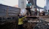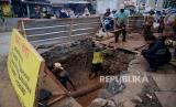 Pekerja menyelesaikan proyek gorong-gorong di Jalan Ciledug Raya, Cipulir, Kebayoran Lama, Jakarta Selatan. Kamis (2/2/2023). Pengerjaan proyek gorong-gorong yang menghabiskan setengah badan jalan tersebut mengakibatkan penyempitan jalan sehingga menimbulkan kemacetan sepanjang hari dari simpang Seskoal hingga melewati Pasar Cipulir. (FOTO : Republika/Putra M. Akbar)