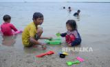 Pengunjung bermain pasir saat wisata di Pantai Lagoon, Jakarta, Jumat (3/2/2023). Manajemen Taman Impian Jaya Ancol membagikan 20.000 tiket gratis untuk berwisata di kawasan Ancol dalam rangka memeriahkan bulan kasih sayang. (FOTO : Republika/Putra M. Akbar)