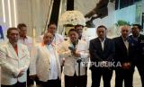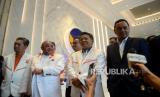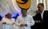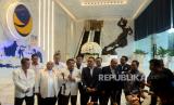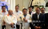 REPUBLIKA.CO.ID,JAKARTA -- Wakil Ketua Majelis Syura PKS Mohammad Sohibul Iman (tengah) bersama Sekretaris Jenderal PKS Habib Aboe Bakar Alhabsyi (kiri) dan Ketua DPP Partai Nasdem Willy Aditya (kanan) bersiap memberikan keterangan usai melakukan pertemuan di Nasdem Tower, Cikini, Jakarta, (3/2/2023). Kedatangan PKS tersebut dalam rangka silahturahmi sesama partai pengusung Anies Baswedan di Koalisi Perubahan.
