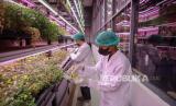 Petani melakukan perawatan tanaman di ruang penyemaian Semaii di sebuah kafe resto di kawasan Alam Sutera, Tangerang Selatan, Banten, Jumat (3/2/2023). Pertanian dengan konsep tertutup atau Controlled Environment Agriculture (CEA) tersebut menanam hingga 20 jenis tanaman yang dipasarkan ke berbagai restoran di Indonesia seperti Arugula, Swiss Chards, Chervil, Viola, Red Veined Sorrel, dan menjadi daya tarik tersendiri bagi pengunjung kafe tersebut. (FOTO : ANTARA FOTO/Fauzan)