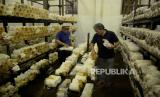 Pembudidaya jamur tiram, Buhari (kiri) saat memanen jamur tiram di kawasan Kebon Baru, Tebet, Jakarta, Senin (6/2/2023). (FOTO : Republika/Putra M. Akbar)