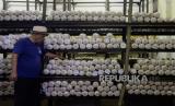 Pembudidaya jamur tiram, Buhari menimbang jamur tiram yang telah dipanen di kawasan Kebon Baru, Tebet, Jakarta, Senin (6/2/2023). (FOTO : Republika/Putra M. Akbar)