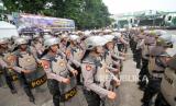 Polisi Anti Huru Hara (PHH) Brimob mengikuti apel gelar pasukan pengamanan Resepsi Satu Abad Nahdlatul Ulama (NU) di parkir timur Gelora Delta Sidoarjo, Jawa Timur, Senin (6/2/2023). (FOTO : ANTARA FOTO/Umarul Faruq)