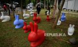 Pengunjung duduk di salah satu instalasi karya seni yang ditampilkan pada pameran Art Jakarta Gardens 2023 di Hutan Kota Plataran GBK, Jakarta, Selasa (7/2/2023).  (FOTO : Republika/Putra M. Akbar)
