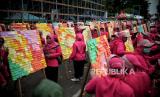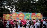 Anggota Fatayat NU menyelsaikan pemecahan rekor muri bergambarkan lima tokoh Nahdlatul Ulama menggunakan kertas berisi harapan dan doa sari jamaah sebanyak 26.000 kertas saat acara Resepsi Puncak Satu Abad NU di halaman Stadion Gelora Delta Sidoarjo, Jawa Timur, Selasa (7/8/2023). (FOTO : Republika/Thoudy Badai)