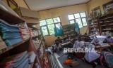 Siswa mengikuti kegiatan belajar mengajar (KBM) di SD Negeri 4 Cilaja, Pandeglang, Banten, Rabu (8/2/2023). Pihak sekolah menyebutkan para siswa terpaksa belajar di ruang perpustakaan tanpa menggunakan kursi karena tiga ruang kelasnya ambruk disebabkan angin kencang dan mengakibtakan sejumlah fasilitas KBM menjadi rusak. (FOTO : ANTARA FOTO/Muhammad Bagus Khoirunas/rwa.)