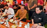 REPUBLIKA.CO.ID, MEDAN -- Presiden Jokowi bersama Menteri BUMN Erick Thohir dan Wali Kota Medan Bobby Afif Nasution menyantap durian dengan sejumlah pemimpin redaksi media nasional di Restoran Sibolang Durian, Medan, Rabu (8/2/2023) malam.