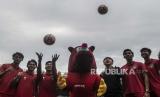 Menteri Pemuda dan Olahraga Zainudin Amali gagal menangkap bola dari tendangan Ketua Umum PSSI Mochamad Iriawan dalam acara 100 Hari Menuju Piala Dunia U-20 Indonesia 2023 di Stadion Utama Gelora Bung Karno, Jakarta, Kamis (9/2/2023). (FOTO : ANTARA FOTO/Aprillio Akbar)