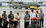 Menteri Koordinator bidang Pembangunan Manusia dan Kebudayaan (Menko PMK) Muhadjir Effendy (keempat kiri), bersama Menteri Pertahanan Prabowo Subianto (ketiga kiri) Panglima TNI Laksamana TNI Yudo Margono (kedua kiri), Menteri Kesehatan Budi Gunadi Sadikin (kempat kanan), Kepala Badan Nasional Penanggulangan Bencana (BNPB) Letnan Jenderal TNI Suharyanto (kedua kanan), KASAU Marsekal TNI Fadjar Prasetyo (kiri), Direktur Jendral Protokol dan Konsuler Kementerian Luar Negeri Andy Rachmianto (Ketiga kanan) melepas misi kemanusiaan ke Turki di Lanud Halim Perdanakusuma, Jakarta, Sabtu (11/2/2023). Pemerintah Indonesia mengirimkan bantuan logistik untuk korban gempa Turki sebanyak lima ton serta mengirimkan personel gabungan tim pencarian dan penyelamatan (SAR) sebanyak 65 orang untuk membantu proses evakuasi. (FOTO : Republika/Thoudy Badai)