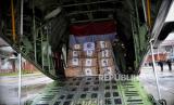 Prajurit TNI AU menata logistik untuk dikirimkan dalam misi kemanusiaan ke Turki di Lanud Halim Perdanakusuma, Jakarta, Sabtu (11/2/2023). Pemerintah Indonesia mengirimkan bantuan logistik untuk korban gempa Turki sebanyak lima ton serta mengirimkan personel gabungan tim pencarian dan penyelamatan (SAR) sebanyak 65 orang untuk membantu proses evakuasi. (FOTO : Republika/Thoudy Badai)