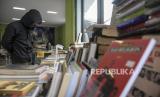 Warga membaca buku yang dipajang pada gelaran Haus Buku 3 di Gedung Perpustakaan Ajip Rosidi, Jalan Garut, Batununggal, Kota Bandung, Provinsi Jawa Barat, Ahad (12/2/2023). Gelaran Haus Buku 3 tersebut menampilkan arsip surat dan buku klasik serta ratusan buku dari sembilan pelapak buku. Gelaran tersebut bertujuan untuk mengenalkan Gedung Perpustakaan Ajip Rosidi sekaligus upaya untuk meningkatkan minat baca masyarakat. (FOTO : ABDAN SYAKURA/REPUBLIKA)