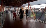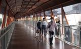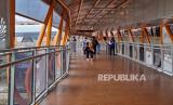 Warga berjalan di Skywalk Kebayoran Lama, Jakarta, Ahad (12/2/2023). PT Transportasi Jakarta (Transjakarta), kini menggratiskan penggunaan skywalk Kebayoran Lama atau menjadi tidak berbayar saat melintasi dalam memudahkan menyeberang jalan. Sebelumnya, warga harus melakukan tap in dan tap out seharga Rp 3.500 jika ingin melintas atau hanya sekadar berswafoto di Skywalk ini sehingga sempat menjadi polemik. (FOTO : Republika/Prayogi.)
