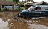 Warga menggunakan mobil menerjang lumpur yang menggenangi jalan di Desa Sempol, Ijen, Bondowoso, Jawa Timur, Senin (13/2/2023). Terjadi banjir bandang susulan pada sore hari yang menyebabkan terganggunya jalur lalu lintas penghubung Bondowoso-Banyuwangi karena terendam material lumpur. ANTARA FOTO/Budi Candra Setya/rwa. (FOTO : Antara/Budi Candra Setya)
