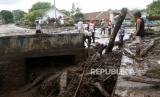 Warga bersama relawan membersihkan material lumpur dan kayu yang menutupi jembatan di Desa Sempol, Ijen, Bondowoso, Jawa Timur, Senin (13/2/2023). Terjadi banjir bandang susulan pada sore hari yang menyebabkan terganggunya jalur lalu lintas penghubung Bondowoso-Banyuwangi karena terendam material lumpur. ANTARA FOTO/Budi Candra Setya/rwa. (FOTO : Antara/Budi Candra Setya)
