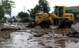 REPUBLIKA.CO.ID,BONDOWOSO -- Petugas menggunakan alat berat membersihkan material lumpur dan kayu yang menutupi jalan di Desa Sempol, Ijen, Bondowoso, Jawa Timur, Senin (13/2/2023).