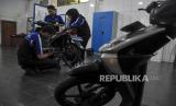 Siswa SMK memeriksa komponen sepeda motor berbahan bakar minyak yang telah dikonversikan ke listrik di Bengkel Kelistrikan TBSM SMKN 8 Kota Bandung, Jalan Kliningan, Lengkong, Kota Bandung, Provinsi Jawa Barat, Selasa (14/2/2023). Siswa kelas XI dan XII jurusan Teknik Bisnis Sepeda Motor (TBSM) mengkonversikan motor berbahan bakar minyak ke tenaga listrik yang diberi nama Matric 8 (Matic Electric). Sepeda motor listrik tersebut memiliki daya 72 volt dan mampu menempuh jarak 50 kilometer hingga 60 kilometer dengan pengisian daya selama lima jam. (FOTO : ABDAN SYAKURA/REPUBLIKA)