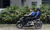 Siswa SMK mengendarai sepeda motor berbahan bakar minyak yang telah dikonversikan ke listrik di halaman SMKN 8 Kota Bandung, Jalan Kliningan, Lengkong, Kota Bandung, Provinsi Jawa Barat, Selasa (14/2/2023). Siswa kelas XI dan XII jurusan Teknik Bisnis Sepeda Motor (TBSM) mengkonversikan motor berbahan bakar minyak ke tenaga listrik yang diberi nama Matric 8 (Matic Electric). Sepeda motor listrik tersebut memiliki daya 72 volt dan mampu menempuh jarak 50 kilometer hingga 60 kilometer dengan pengisian daya selama lima jam. (FOTO : ABDAN SYAKURA/REPUBLIKA)